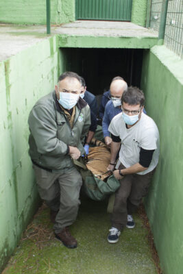 Foto: tijger Luli wordt o.a. door Pablo Delgado (r) weggehaald uit een gesloten dierenpark. Luli (op foto boven bij AAP) werd eerder verhuurd voor evenementen en ander vermaak.